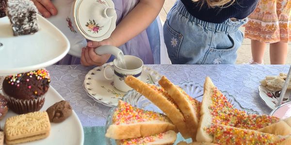 The menu for the Tea Party includes a selection of delicious treats. The China teapots will hold water and cordial, while a variety of sandwiches, including Vegemite and strawberry jam, will satisfy the hungry partygoers. Biscuits, cookies, wafers, muffins, cupcakes and fairy bread add to the delightful spread.